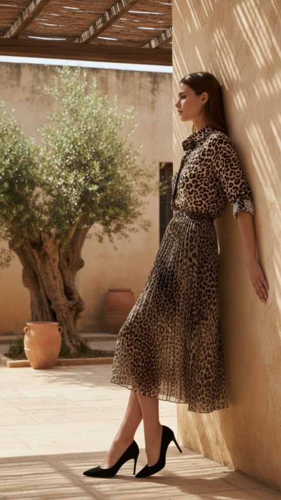 Este vestido maxi de seda, con su opulento estampado selvático y audaces detalles de leopardo,…