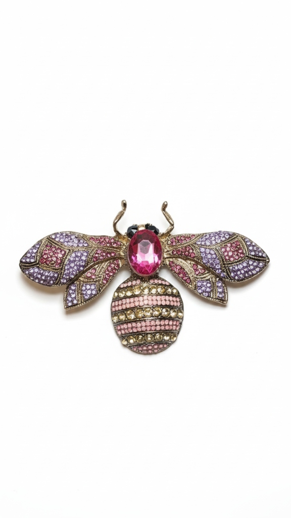 La pieza está elaborada sobre una base metálica con acabado en oro envejecido, proporcionando ese aire de joya de colección. El cuerpo del insecto está adornado con franjas de cristales rosas y dorados, mientras que las alas presentan un intrincado trabajo de micro-cristales en tonos violetas y púrpuras. El centro de la pieza está coronado por un gran cristal facetado en color rosa intenso que atrae todas las miradas.