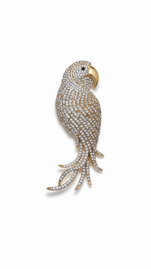 El broche Loro es una pieza de declaración (statement piece) que celebra la elegancia de la naturaleza con un espíritu maximalista. Su silueta, que evoca a una cacatúa o loro de hombros erguidos, está diseñada para transmitir poder y distinción. Es una joya que no solo complementa un atuendo, sino que lo define.