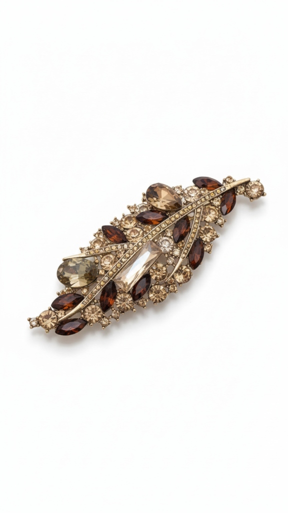 Cada cristal ha sido engastado a mano sobre una base de aleación metálica con acabado en oro envejecido, lo que otorga a la pieza un carácter de «herencia familiar» o joya antigua de gran valor. La paleta cromática transita desde el champagne más delicado hasta el marrón chocolate intenso, permitiendo una versatilidad excepcional tanto para eventos de día como para veladas formales.