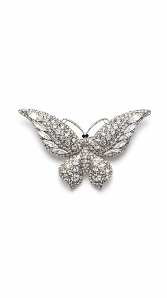 El broche Mariposa es una pieza maestra de la simetría y el brillo. A diferencia de las versiones en color, esta joya apuesta por la pureza del cristal transparente y el metal plateado, evocando la estética de la alta joyería de diamantes. Su diseño extendido y sus proporciones equilibradas la convierten en la opción preferida para los eventos más formales.