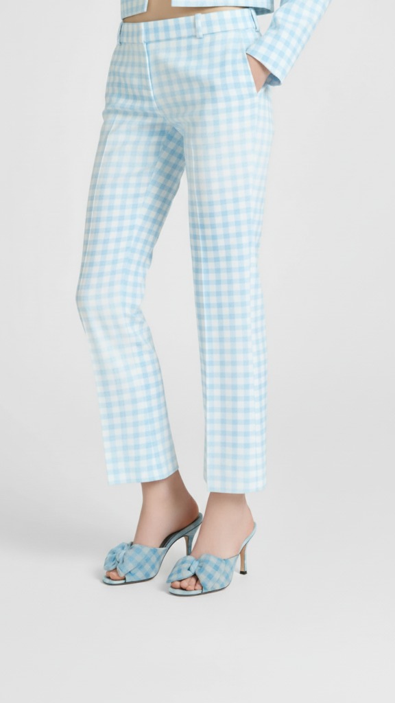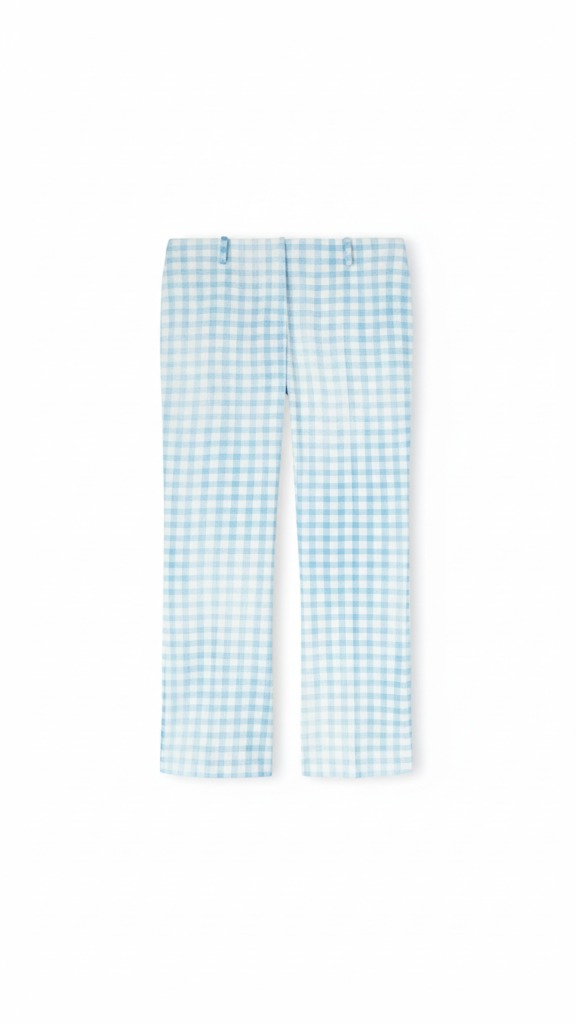 Eleve su guardarropa con estos pantalones sastre de cuadros vichy en azul y blanco. Confeccionados con un tejido premium de composición [885], su corte impecable y talle alto realzan la figura, aportando un toque de frescura y sofisticación atemporal. Perfectos para un estilo chic de día o noche, son un esencial versátil para la mujer moderna. Pantalones lujo, vichy, corte sastre, moda chic.