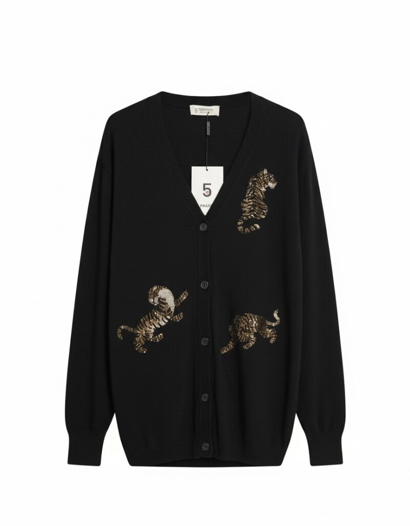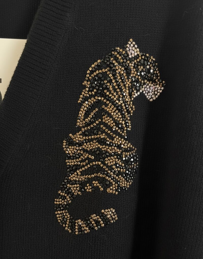 Añade un toque de lujo audaz y sofisticación brillante a tu armario con nuestro impresionante cárdigan de cashmere lana en color negro profundo. Esta prenda esencial de entretiempo esta meticulosamente elaborada con transfer swarovski brillantes en tonos oro, bronce y negro. Cada detalle está diseñado para capturar la luz y la atención.