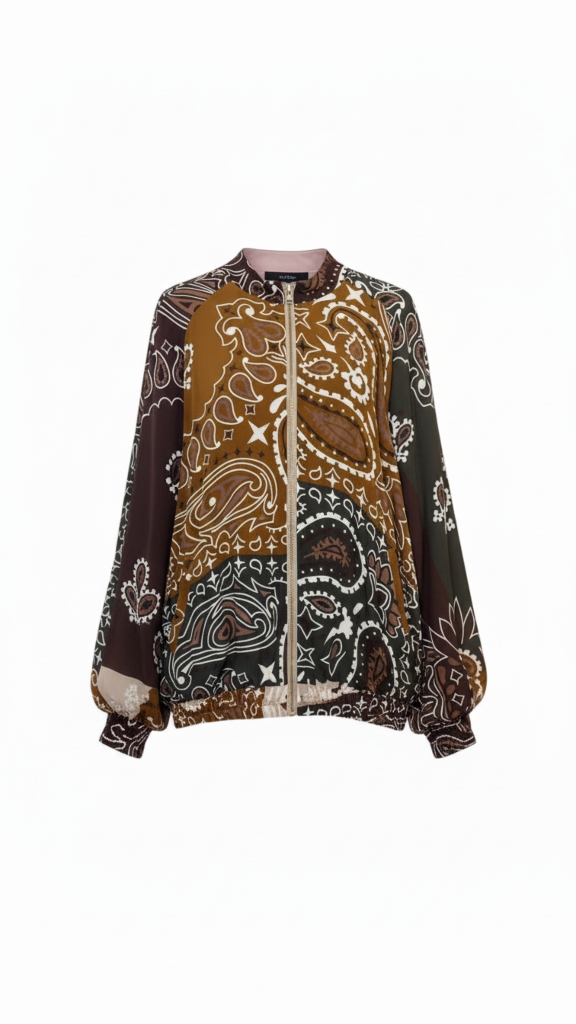 Eleva tu estilo con esta chaqueta bomber reversible, confeccionada en un tejido ligero y fluido con un sofisticado estampado paisley y gráficos abstractos. Su diseño versátil y su paleta de tonos tierra la convierten en la pieza definitiva de Quiet Luxury, ideal para cualquier ocasión y transición de temporada.
