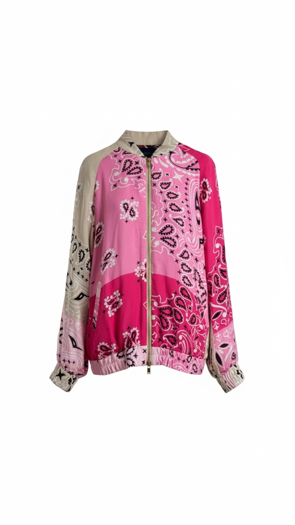 Esta bomber jacket reversible es una obra de arte textil, fusionando una rica paleta de patrones paisley y gráficos abstractos en tonos tierra, blanco roto y verde oscuro. Cada panel ha sido meticulosamente ensamblado para crear una sinfonía visual armoniosa, revelando una atención al detalle propia de la alta costura. Confeccionada con un material ligero y sutilmente fluido, esta pieza ofrece una sensación etérea al tacto y un drapeado impecable. Su silueta relajada se define por delicados puños y bajo elásticos, mientras que el cierre de cremallera metálica y el forro interior contrastante añaden toques de lujo discreto. Ideal para transiciones estacionales, es la definición de versatilidad de lujo, una pieza clave que encapsula la elegancia sin esfuerzo.
