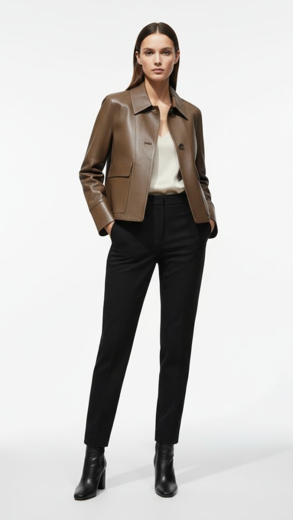 Sumérjase en la exquisitez de nuestra chaqueta de piel premium, una declaración de estilo confeccionada con una maestría artesanal que se percibe en cada puntada. Su piel, de una suavidad inigualable y un tacto suntuoso, se adapta elegantemente a una silueta contemporánea ligeramente cropped. Destacan detalles técnicos como el cuello de solapa clásico y los botones discretos, mientras que los bolsillos de parche con solapa y los puños anchos estructurados aportan funcionalidad con un aire refinado. Esta pieza es la personificación del lujo silencioso, ideal para infundir sofisticación atemporal a cualquier conjunto, elevando su guardarropa con una inversión duradera.