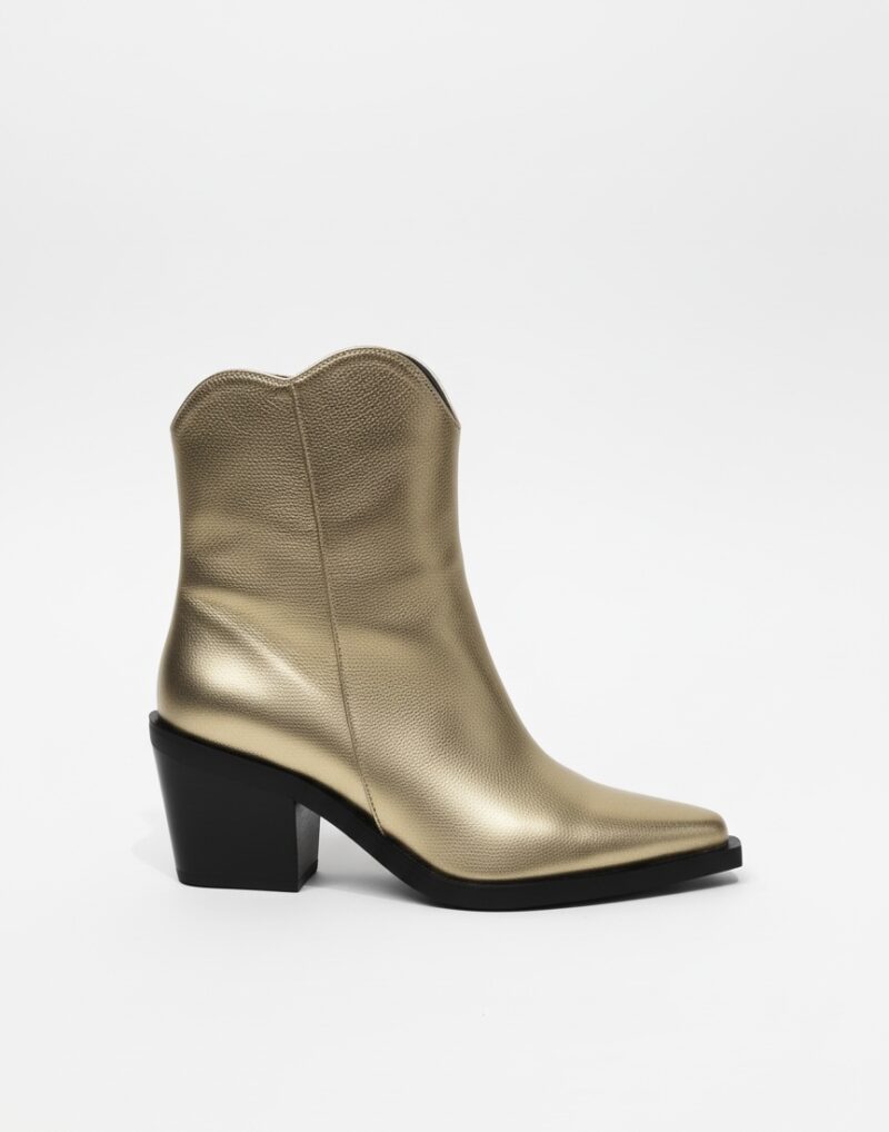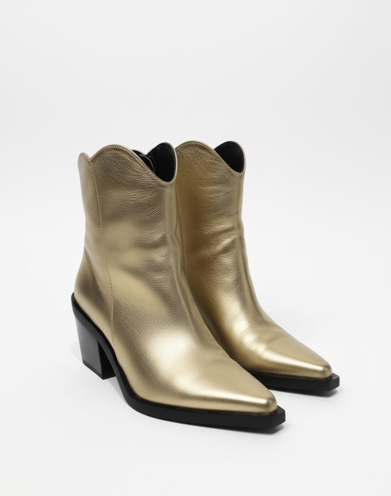 Botines dorados de piel con tacón medio. Diseño estilo cowboy moderno, perfectos para elevar cualquier look con un toque audaz y sofisticado.