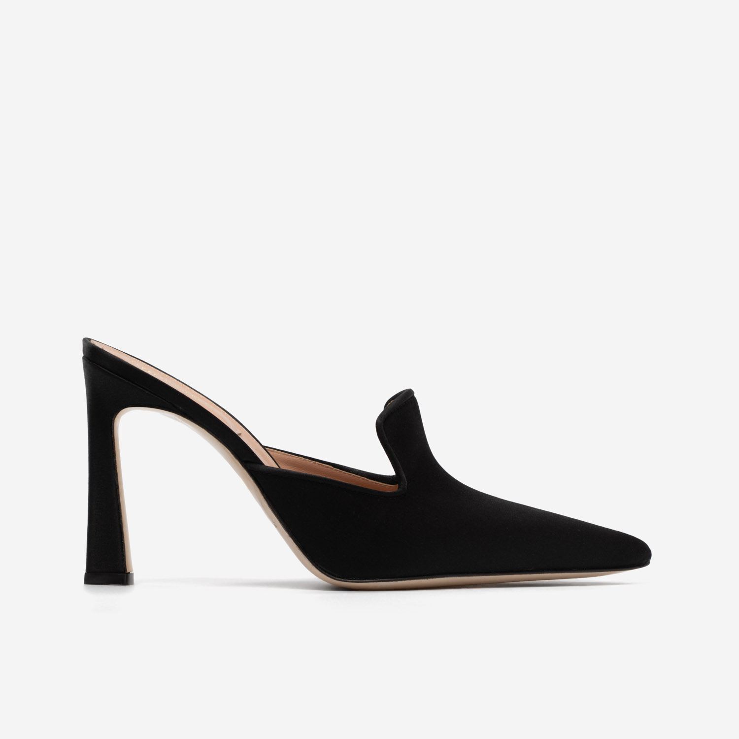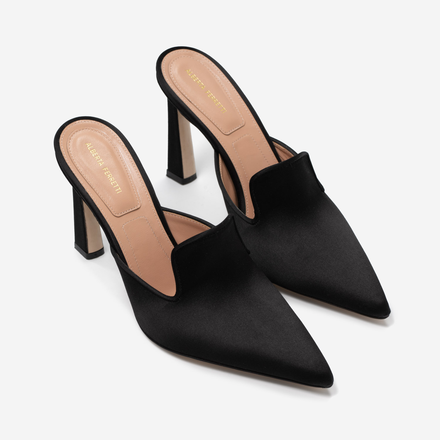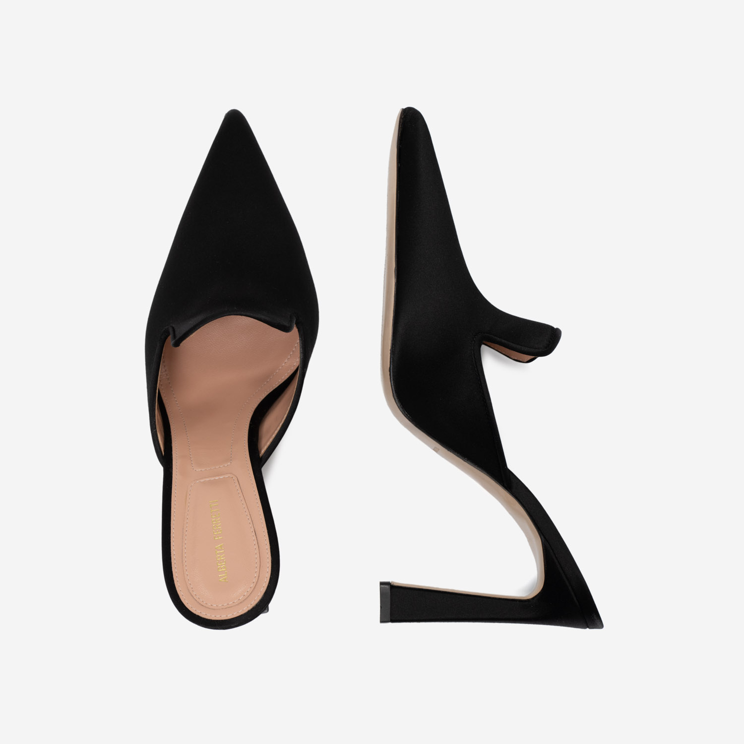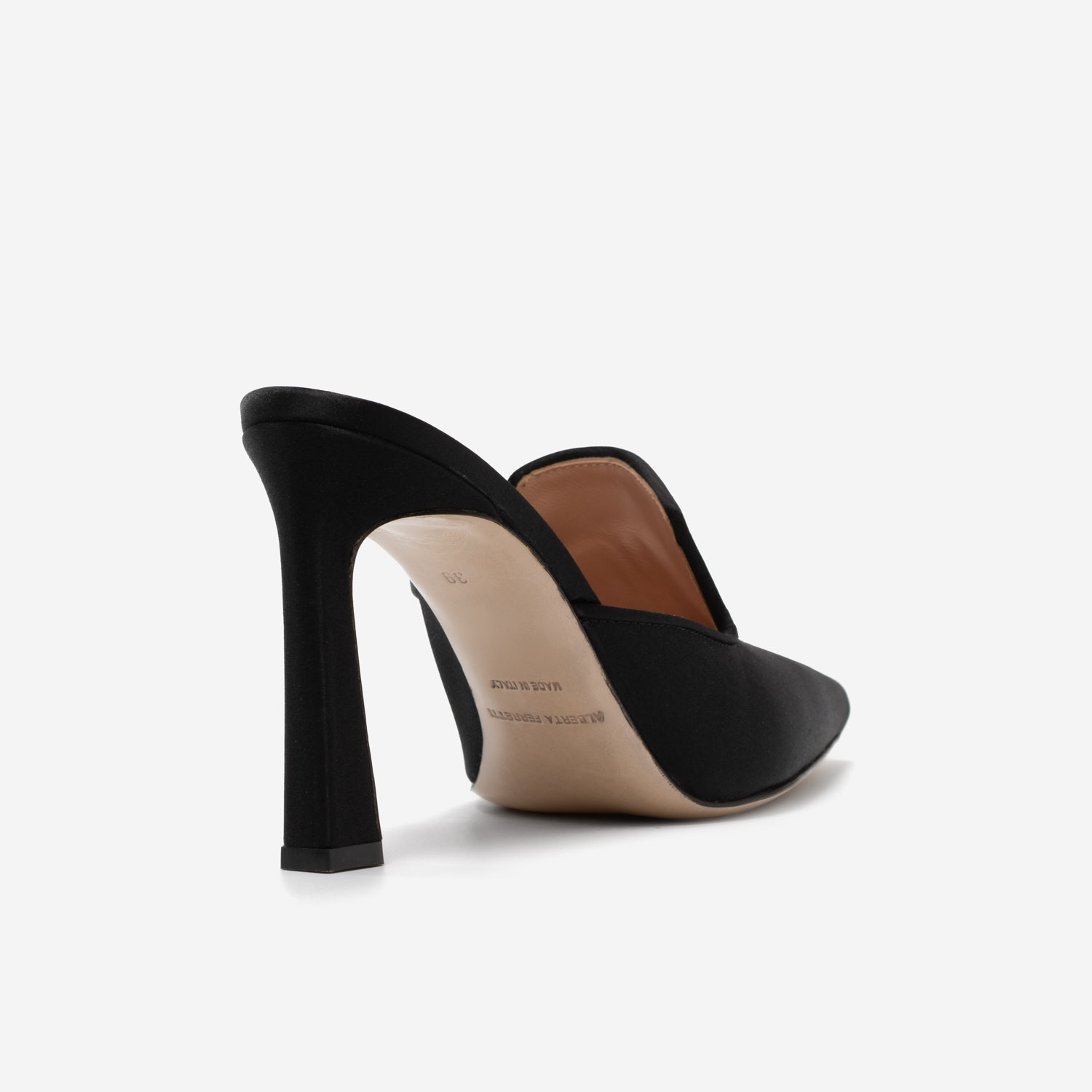 Eleva tu estilo a la máxima expresión del lujo con este impresionante mule de satén negro, una pieza icónica de la prestigiosa casa de moda italiana Alberta Ferretti. Este zapato, diseñado para la mujer cosmopolita y segura de sí misma, está meticulosamente confeccionado en satén de la más alta calidad, que refleja la luz con un brillo sutil y elegante. Su silueta afilada y la delicada línea de su escote evocan una sofisticación minimalista y poderosa.