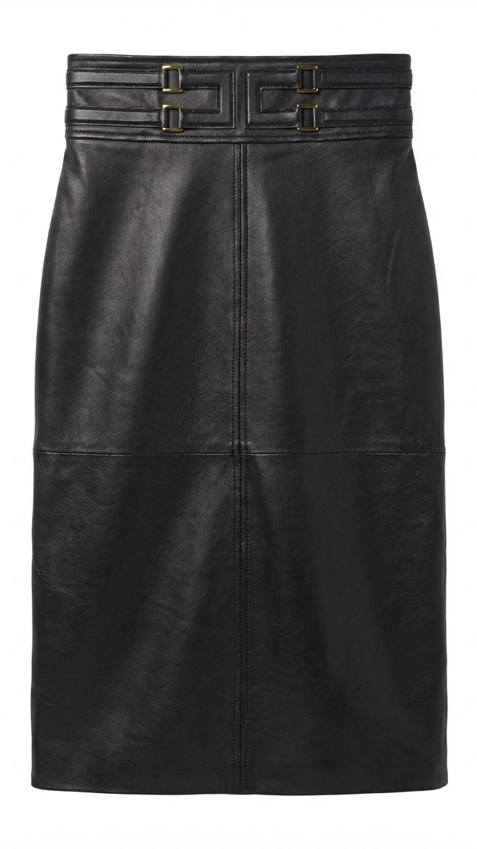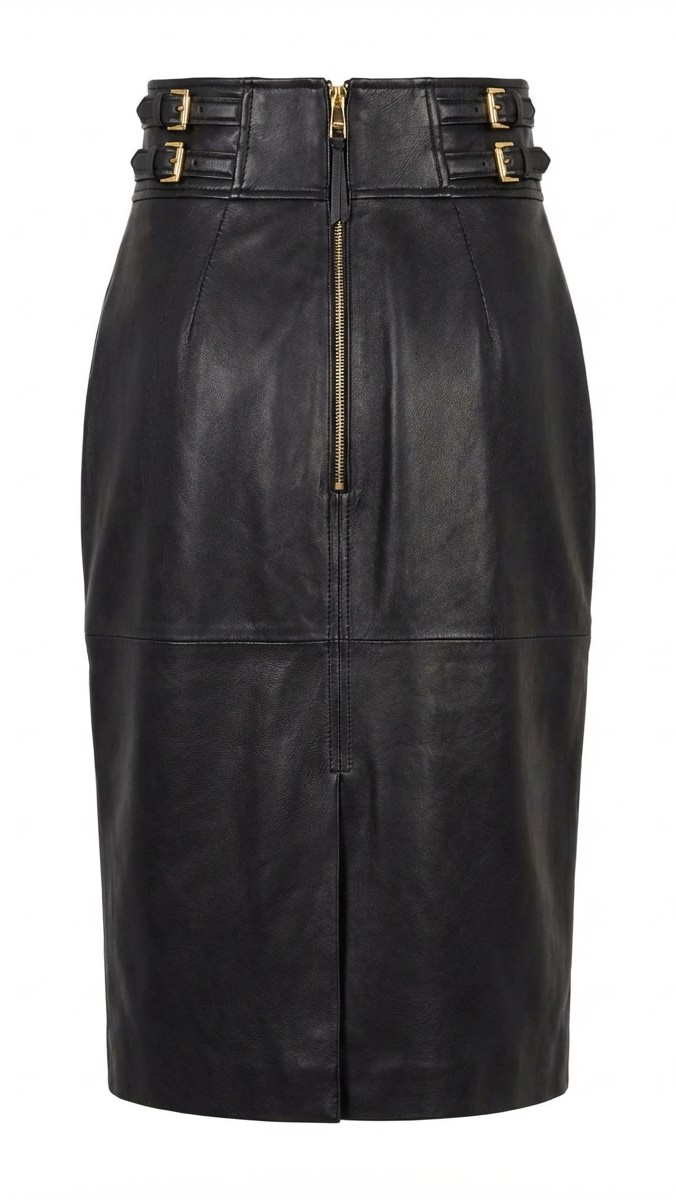 Esta falda de cuero de corte lápiz. Presenta un sofisticado talle alto acentuado por cuatro hebillas decorativas doradas que le confieren un estilo elegante. El cuero de alta calidad garantiza un ajuste perfecto y una durabilidad excepcional, convirtiéndola en el equilibrio ideal entre audacia y lujo.