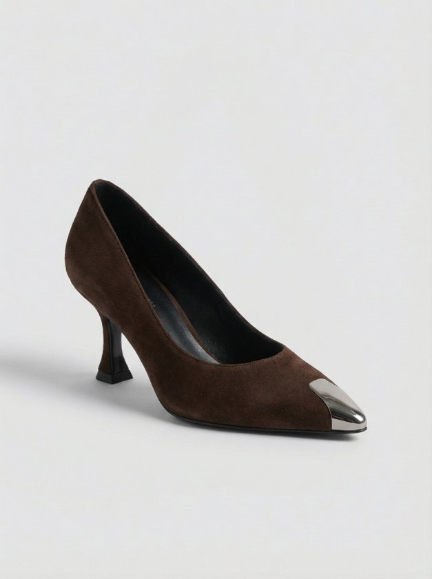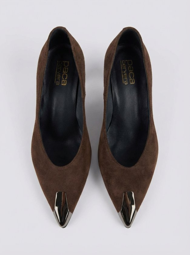 Estos sofisticados salones están confeccionados en ante premium de color marrón chocolate, ofreciendo una textura suave y lujosa que se adapta con elegancia a cualquier silueta. El diseño destaca por su puntera metálica plateada, un detalle vanguardista que no solo protege el calzado, sino que aporta un contraste moderno y chic ideal para elevar tus looks de oficina o eventos especiales.